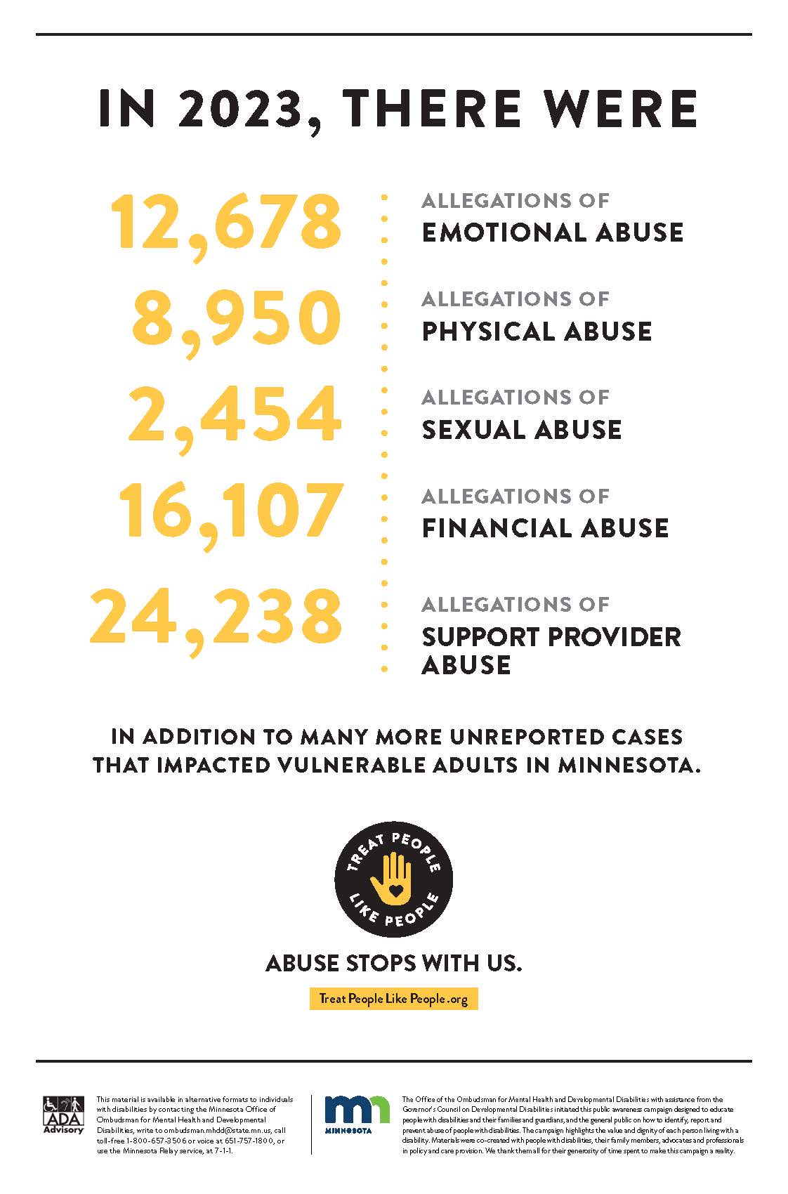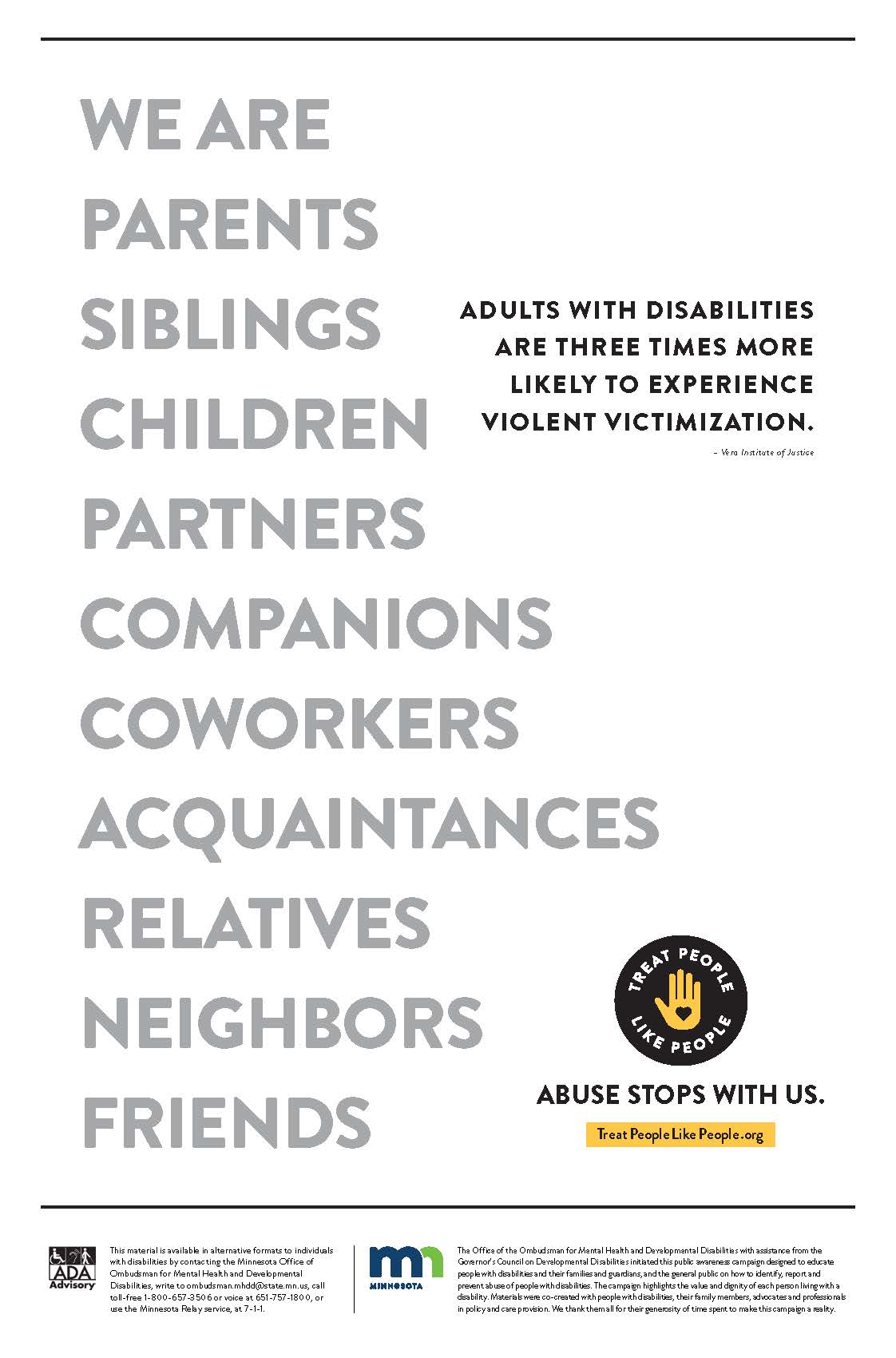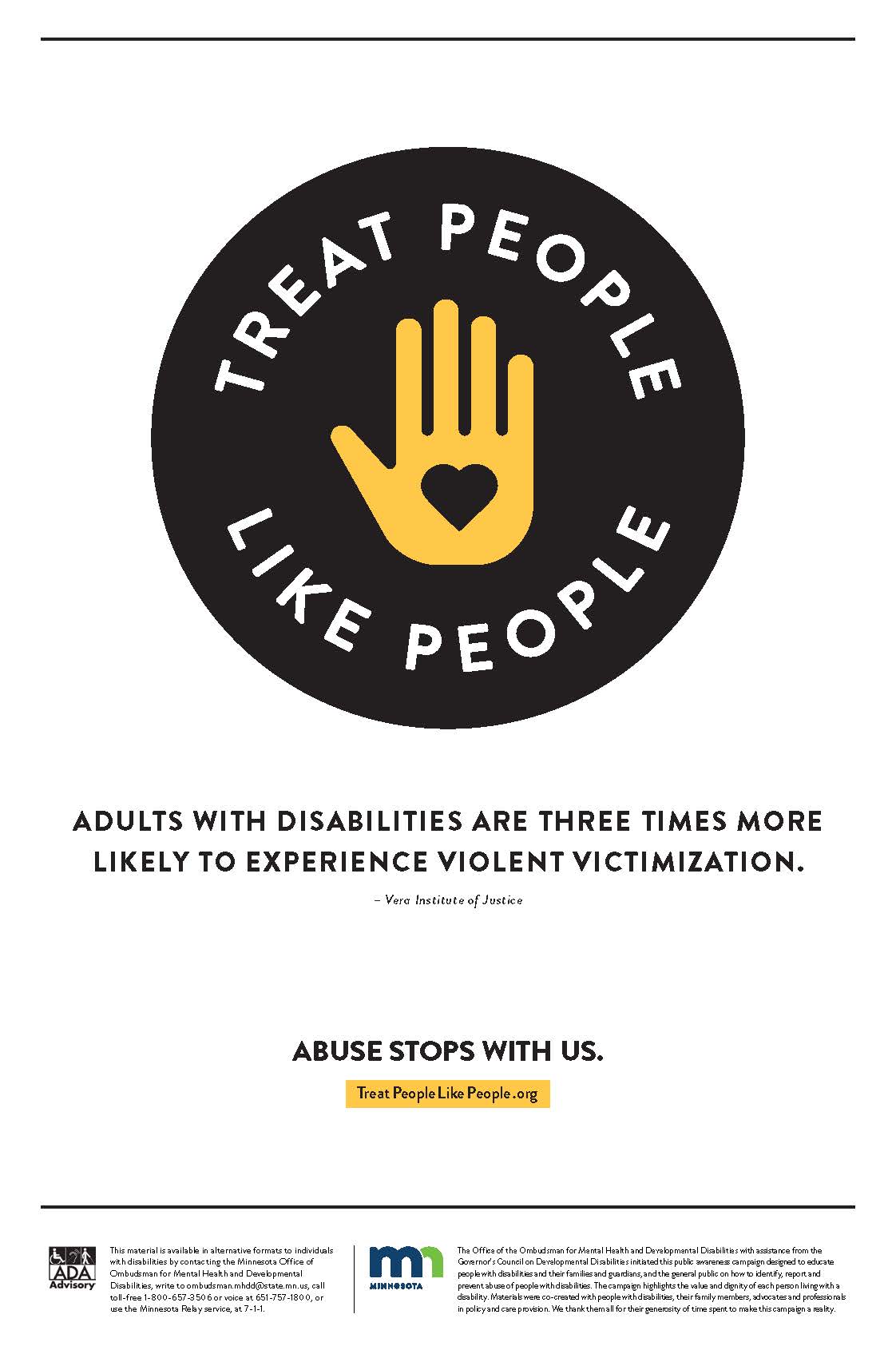People with disabilities are often vulnerable to neglect, exploitation, and abuse. Your family, friends, neighbors, or even yourself could be at risk. But together, we have the power to stop maltreatment. Download the materials below to stay informed and become part of the solution.